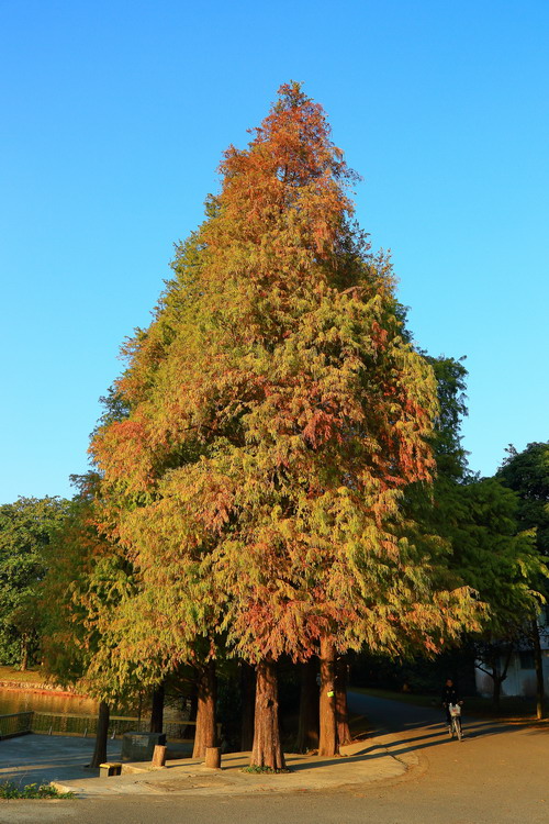 水生植物园两岸的落羽杉最年轻,为前几年所种,还比较纤细,气生根也不发达,现在已有不少变成红叶,穿梭于林中,看漫天飞舞的红叶,别有一番韵味。