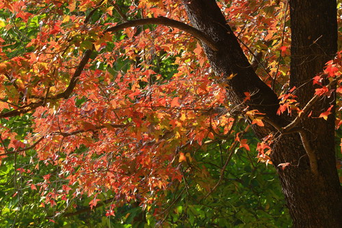 另外,除了落羽杉红叶,园内还有其它变叶树种。其中枫香(Liquidambar formosana)和大叶紫薇(Lagerstroemia speciosa)的树叶已变红。