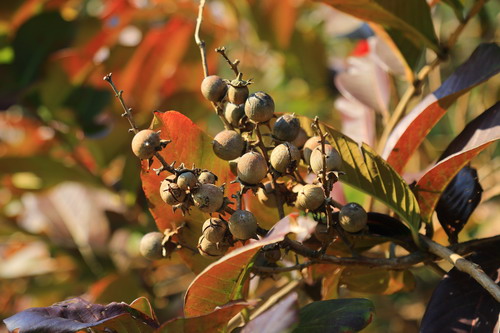 大叶紫薇还结果了呢,现在可以观赏到红叶与果实齐挂枝头的美丽景象。