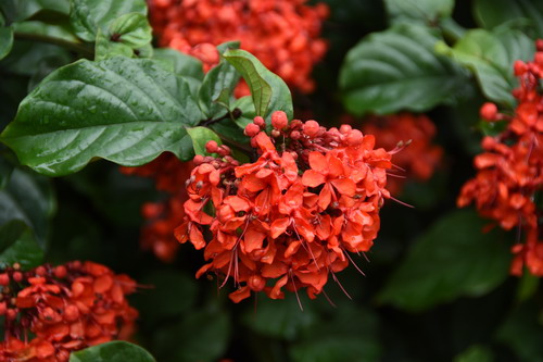 远远地看,艳赪桐的花开成一团团红色,如火焰、如祥云,点缀在绿墙上。走近了细细地赏,它的叶片椭圆形,成对地着生在枝条两侧,边缘微微波皱着,聚伞花序顶生,每个花序上,挨挨挤挤地排着十几朵至几十朵红色的花朵。这种红,是正正的中国红,不光花瓣是红色,连花萼、花蕊和花蕊上的花药都是红色的。5枚花瓣向四周舒展开来,雄蕊和雌蕊仿佛从中央喷射而出,略带些弯卷。你看着看着,眼前似是红红的火焰,又似有几只、十几只甚至几十只红火的蝴蝶开始振动翅膀,欲从火焰中飞将而出……