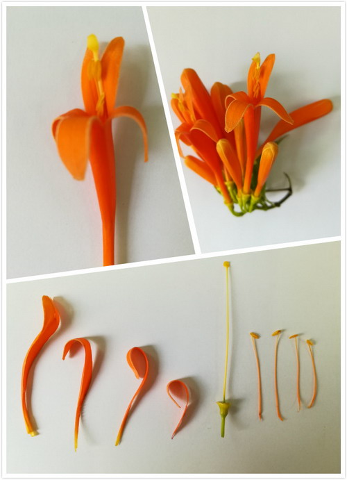 春未到,花已开,目前华南植物园炮仗花正浓烈绽放,以席卷的姿态捎来春的讯息。炮仗花(Pyrostegia venusta (Ker-Gawl.) Miers),又名黄金珊瑚、黄鳝藤,紫葳科(Bignoniaceae)炮仗藤属,二歧状复叶对生,小叶片卵形,顶端长渐尖,两面无毛,背面具细而分散的腺穴,圆锥花序生于侧枝的顶端,长约10-12厘米。花萼钟状,小齿5,花冠筒状,内面中部有毛环,基部缢缩,橙红色,裂片5,长椭圆形,花蕾时镊合状排列,花后反折,边缘有被白色柔毛,雄蕊着生花冠筒中部,花丝丝状,花药叉开,子房密被柔毛,花柱细,柱头舌状扁平,花柱与花丝均伸出花冠筒,连串着生,垂挂树头,状如鞭炮。