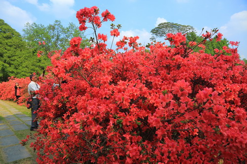 年刚过完,这杜鹃花已经耐不住性子迫不及待地开花了。是啊,一夜之间,羊城已进入夏天,如果再不开花就要错过春天了。如今,一入华南植物园正门,就能看到一大片火红的杜鹃花开得格外灿烂,艳丽的颜色,在满园绿色的衬托下,显得格外鲜艳夺目,过往的游客无不驻足观赏,拍照留影。