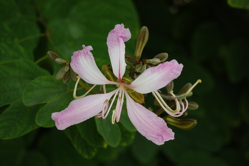 广州街头常见栽培的还有一种开桃红色花的则是羊蹄甲(Bauhinia purpurea L.),它与洋紫荆相比,花瓣狭长,边缘常常有褶皱,能育雄蕊3,花丝与花瓣等长,退化雄蕊5-6。与洋紫荆每年春季开花不同,羊蹄甲每年秋冬9-11月开花,开花后能正常结带状荚果。