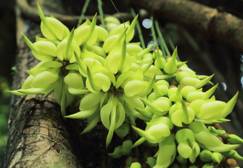 禾雀花为豆科油麻藤属(Mucuna)几种植物的统称,包括白花油麻藤(Mucuna birdwoodiana Tutcher)、大果油麻藤(Mucuna macrocarpa Wall.)、常春油麻藤(Mucuna sempervirens Hemsl.)等。每年3月份她们相约而来,三五成群、互聚相拥,以各式各样的姿态停落在树丛里的枝条上,令人目不暇接。禾雀花的花型奇特,每朵花都像一只只小小的麻雀,花瓣似翡翠一样晶莹剔透,娇艳欲滴,整朵花跟真“禾雀”鸟一样。近近观赏,“禾雀”的“头、嘴、翼、尾”“四脏”俱全。剥开花萼上的棕色绒毛,禾雀的两只眼睛就展现在人们眼前,让人不禁赞叹大自然巧夺天工的杰作。禾雀花含苞者如雏鸟待哺,盛开者如小鸟振翅欲飞,成串吊挂在悠长盘曲的藤蔓上,每串二三十朵花,远远望去犹如万鸟栖枝。