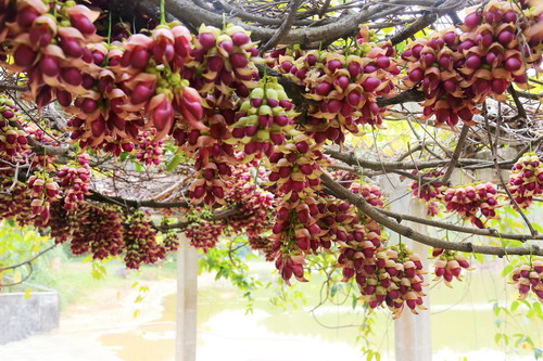 除了最常见的白色禾雀花,华南植物园内还有罕见的粉红色、深紫色及紫白相间的禾雀花。这些“彩色”禾雀花,花色艳丽夺目,除“头部”为绿色略带锈色绒毛外,其它部位均是紫色或粉红色和白色相间,形态奇特,小巧玲珑,可爱又好看。