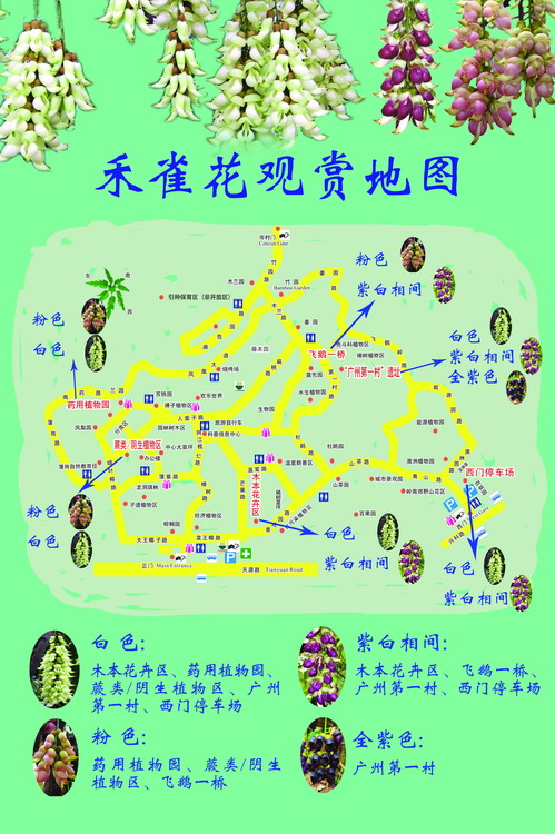 禾雀花观赏点:木本花卉区、飞鹅一桥、蕨类/阴生植物区、药用植物园、广州第一村、西门停车场