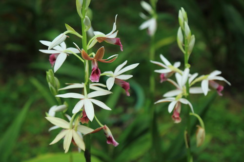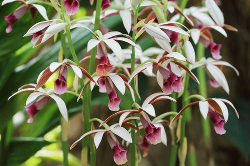 鹤顶兰(Phaius tancarvilleae (L’ Hér.) Bl.)为兰科多年生常绿地生草本。植株大型,高70~80cm;假鳞茎圆锥状,粗短肥厚、肉质,被鞘;叶2~6枚,互生,阔长圆状披针形,长30~80厘米,宽6~12厘米,纸质,具纵向折扇状脉。总状花序由假鳞茎基部或叶腋抽出,粗壮直立,高达60~110cm,着花10朵~30余朵,花大,美丽,直径7~10cm,花朵外面白色,内面暗赭色或棕红色;唇瓣管状,背面白色带茄紫色的先端,内面茄紫色带白色条纹。唇瓣与5个花被片巧妙组合,宛如仙鹤展翅飞翔,故名。花被片的背面为白色,唇瓣为红色,因此又被称为“花白心红”,极富特色。花期春末夏初。
