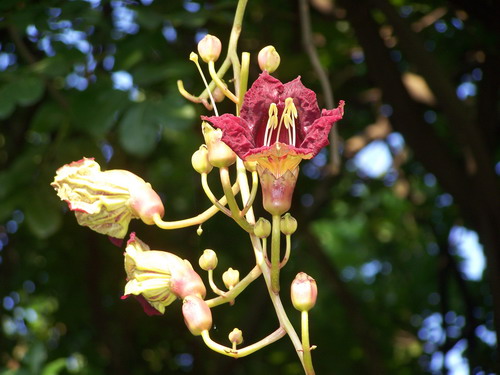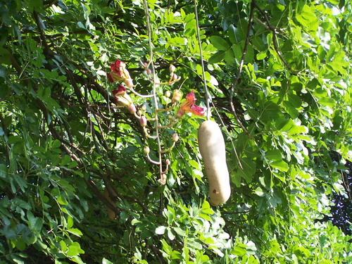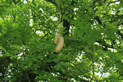 吊瓜树Kigelia africana (Lam.) Benth.,紫葳科吊灯树属常绿乔木,高可达20米,树冠圆伞形。春夏开花,圆锥花序生于小枝顶端,花序轴下垂, 花萼钟状,革质,长4.5-5厘米,花冠桔黄色或褐红色。果坚硬,肥硕,果柄长8厘米,圆柱状浆果悬于树上达半年不落,种子镶于木质果肉内。