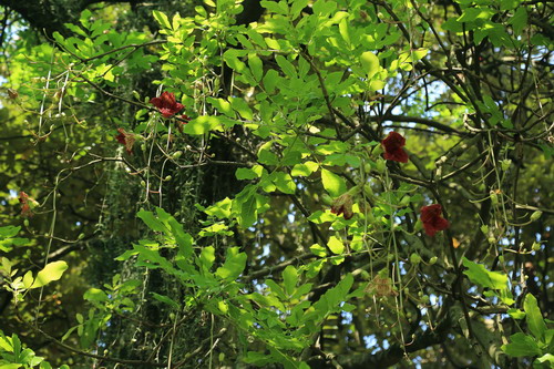 4月中旬的一天午后时分,微雨中信步来到华南植物园中心大草坪,在办公楼和贵宾手植树区交界处,满地硕大深红花朵,抬头发现是枝叶匝密的吊瓜树。在别处见过挂果的吊瓜树,但花却是第一次见到。眼睛有福了,草地上、树周边,美且硕大的红花目不暇接,那天顾着观赏、拾捡,忘了给树为花拍一张照片。