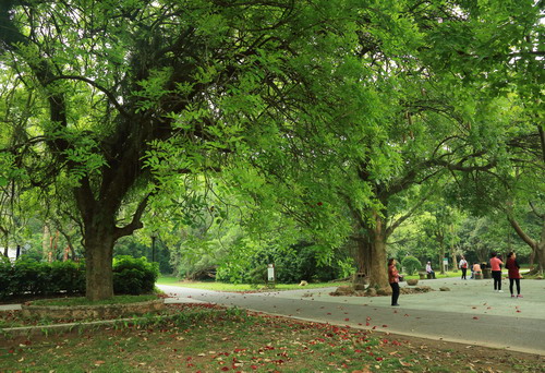 离开时,从细叶榕路口回望,中心大草坪宛如大客厅,高大浓密的吊灯树树枝交汇处形成高高的拱顶,就像迎客的门廊,到了夜晚,下垂的“吊灯”灯盏将依次盛放,而今夜,紫红的花灯又在守候迎接哪一位来客呢?或垂挂枝头、或深藏叶间的一个个“吊瓜”,是否是久存的佳酿,期待一场密契的小酌呢?想到这里,已然觉得醉了。