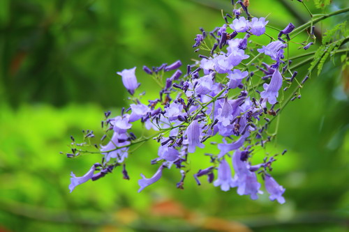 蓝花楹的花是蓝紫色的,是大海的颜色,朵朵小花簇傲立枝头,弥漫于整个树冠,也缀满天空,薄薄的花冠,带着好看的小波浪卷,绽放时顶生或腋生的圆锥花序一缕缕,渐变的蓝紫色与蓝天遥相呼应,花边开边落,落英缤纷,林下也是一片蓝色,淡淡的颜色给人回归内心静谧的力量。