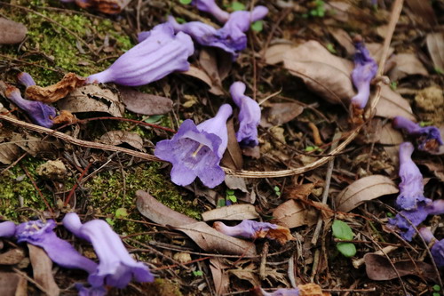 蓝花楹是美丽的观叶、观花植物,在紫葳科这个美花大科里也算佼佼者,喜欢充足阳光,温暖多湿的气候。蓝花楹的果是扁卵圆形木质蒴果,中心厚,边缘薄,内含带翼的小种子,但华南地区由于积温不够等原因,结实较少。如果足够幸运,你会发现花间还有旧年的果实挂在枝头久久不愿离去,仿如种子对大树妈妈的情谊。