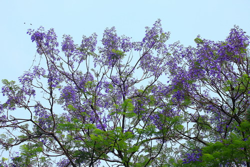 蓝花楹(Jacaranda mimosifolia D. Don)是紫葳科蓝花楹属落叶乔木,又名巴西红木、含羞草叶楹、蓝雾树。二回羽状复叶,花序为圆锥花序,其花为完全花,花钟形,花冠二唇形,2强雄蕊,花萼顶端5齿裂,花繁多,呈蓝紫色,在华南地区花期4-5月,现正值盛花。
