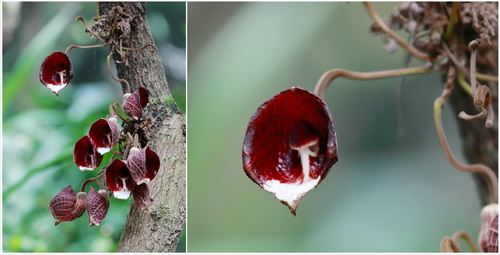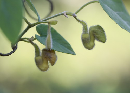 马兜铃科植物大多是藤本,花朵有的在藤的末端,随风飘动,暴露易见;有些则长在靠近藤的根部,被叶子遮挡,需要一双猎人般的眼睛才能看到,如广西马兜铃(Aristolochia kwangsiensis),它也是马兜铃家族中颜色较为艳丽的一种。