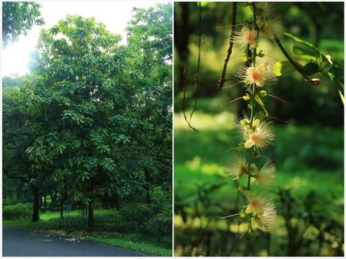 梭果玉蕊为我国特有植物,玉蕊科常绿大乔木,高15-30米。叶大型倒卵状椭圆形,15-30厘米,聚生小枝顶端。果实梭形,两端小中间大,无棱角,生长奇快,花后约半个月就可长到10厘米,串串梭果随风摇摆,也不失趣致。花果期5-7月。