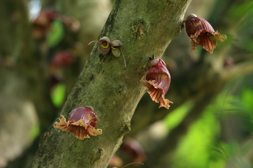 叉叶木(Crescentia alata Kunth)是紫葳科葫芦树属常绿小乔木,株高3-6m,叶簇生于小枝上,小叶3枚,十字形,长倒披针形或倒匙形,近无柄,侧生小叶2枚,花1-2朵生于小枝或老茎上,雄蕊4枚,花冠佛焰苞状,具紫褐色斑纹。花期5-6月和10-12月,炎夏花正鲜,叉叶木树身开花,远远望去,如成群紫色小高脚杯附着其间,温润敦厚,洗练的美。