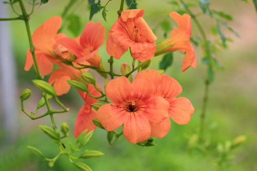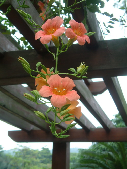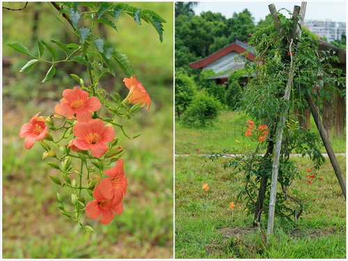 凌霄原产我国,分布比较广,喜温湿环境,也耐半荫,用扦插、压条都可以繁殖。花开时枝梢仍然继续蔓延生长,新梢又次第开花,从夏日一直开到金秋。