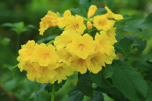 黄钟花,紫葳科黄钟花属常绿灌木,对生奇数羽状复叶,花冠漏斗状钟形,基部收缩呈细管,花常数朵头挨着头、肩并着肩、手拉着手环成一个圈,远观宛如众多小喇叭组成的黄绣球。黄钟花拉丁名为Tecoma stans,其属名Tecoma源于墨西哥语tecomaxochit,指黄钟花,由此可见一斑,黄钟花是外来种,原产南美和西印度群岛;种加词stans意思是直立的,黄钟花的茎直立,非常有精气神,在普遍较为“慵懒”的灌木丛中独树一帜。