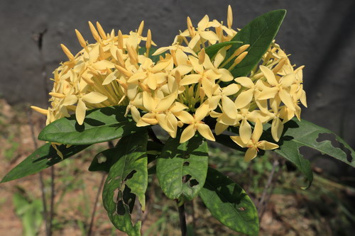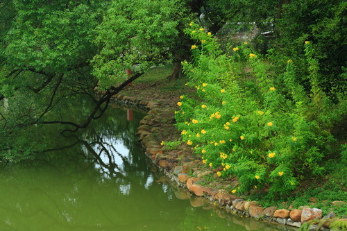 除黄钟花以外,在这美丽的华南植物园里,放眼望去,灌木的、开的不知疲惫的黄花比比皆是,荚果两个一组的双荚决明、荚果有翅的翅荚决明、花密集呈半球形的黄龙船花、花苞形似蝉蛹的黄蝉花等等,大有秋花更比春芳魅之势。这些花儿就好像邻居小孩,我们呼吸着同样的空气,看着它们从小到大,习以为常。忽然一个转身,被深深触动,在华南植物园彩虹桥边,秋晴的阳光下,黄钟花绿树黄花倒影在水中,鱼戏浅底,顿时一幅绵延的山水画从心中蔓延。秋光冉冉,岁月匆匆,风景无处不在,在感叹时光飞逝的同时,或许我们最该留意的是生活中凡常的美好。