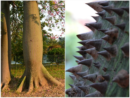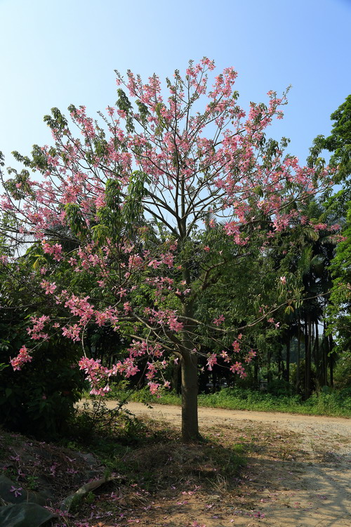 走进华南植物园木本花卉区,也会发现一棵高大的树上开满这种艳丽的花朵,她就是和广州市花木棉花同科的姐妹花——美丽异木棉。她两都是木棉科落叶大乔木,木棉的花期为春节,而美丽异木棉花期为秋冬季。美丽异木棉开花时满树鲜艳的花朵,绚丽耀目,异常美丽,故也被称为“美人树”。