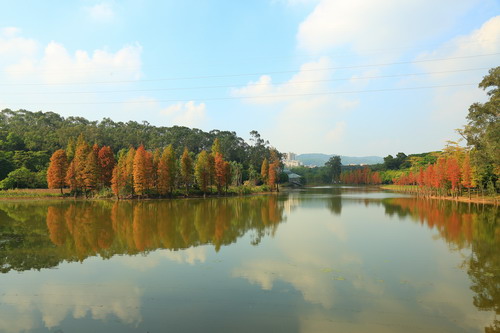 落羽杉、池杉、水松、水杉等都喜欢生长在水边,华南植物园水边有多处观赏红叶的景点——龙洞琪林(孑遗植物区、棕榈园)、水生植物园两岸及湖中心露兜园、科普信息中心前三拱桥边。各个景点的树叶变色程度不同,有的树已基本全部变红,最慢的才则刚刚开始变色。现如今,园内绿叶、黄叶、红叶共存,色彩丰富绚烂。