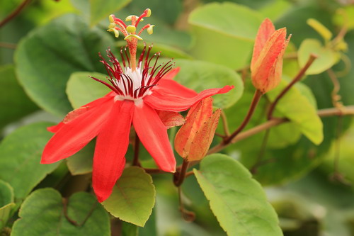 ▲红花西番莲Passiflora miniata,西番莲科西番莲属