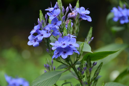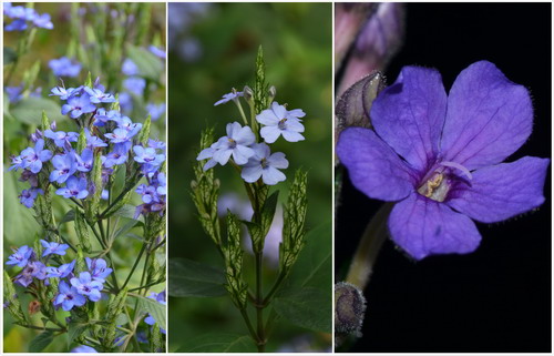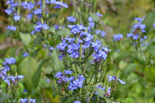 华南可爱花,既然有华南二字,是不是就产华南地区了?不完全对,除了华南的广东、广西外,西南的贵州和云南也有分布。其与可爱花相比,它的植株稍矮小,分枝没那么多,茎也不如可爱花粗壮,叶片多为椭圆形至狭椭圆形,稍小,在细节特征上,花色蓝色至浅蓝色,苞片上具缘毛。华南可爱花在不同环境下,不同水肥条件下的表现也会有所不同。它的蓝色,在三姐妹中色泽是最淡的,是浅蓝的那种,带有绢的质感,如小家碧玉般清秀。华南可爱花有一个特点,花后一段时间里花朵凋而不谢,仅由淡蓝色变成淡黄色或淡黄褐色,尤立枝头,仿佛不肯、不甘离去吧,有那么点小小的、淡淡的愁。
