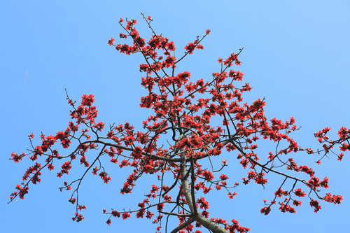 木棉的巅峰风景在春天。木棉先开花,后发叶,早春开花,树干挺拔,掌状叶片亭亭如盖,横看竖看都是美美哒,尔以为足矣,然而最美的风景却在盛花时节,木棉花浓烈绽放,仿佛撼天动地的一团团火焰,通透的红色直冲云霄,有着欲与天公试比高的气势。木棉花开震撼,落花也壮观,凋零时整朵花脱落,有别于花瓣飘零。木棉花瓣肉质,花瓣手感醇厚,被少量绒毛,在上班上学途中,忽然一朵木棉花掉在面前,像是突然蹿出来向你问好的顽童,若有兴致,捡起落花,让它唤醒童心,陪伴你一整天的愉悦。