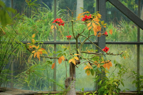 在华南植物园,你还能遇见与寻常“不一样”的木棉。热带雨林温室内经嫁接修剪后的木棉盆景,树姿奇特,个子矮了不少,妈妈再也不用担心我拍照打卡困难了,“so easy”;沙漠温室内来自美洲的龟纹木棉为多年生肉质植物,同样早春开花,花朵硕大,大相径庭是其花冠为数百条白丝组成,花丝多而长,银丝万缕,别有一番风采;在达尔文雕像附近,有一亭台取其木棉之意境,名为“红棉”,在这万花争春之际,邀你于华南植物园感受“曲径通幽,春花意浓”。