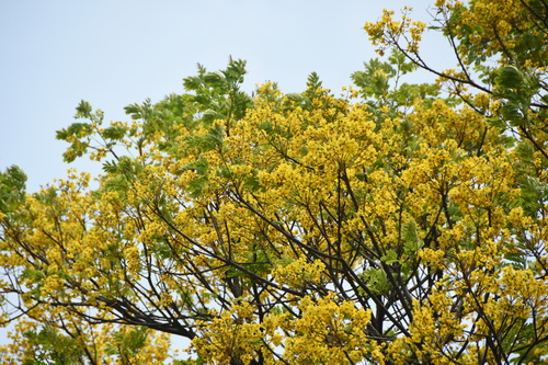 远远就看到了园里不少区域的这一片片金黄,走近了,引入眼帘的是一树树的黄花悠然开于高高的顶上,这是豆科盾柱木属的银珠Peltophorum tonkinense,名为为银珠,花却为金黄色,颇为令人费解,应该叫金珠或者金花才是?!株株银珠黄花轻摇,仿佛笑道“低调,低调!再说,名字也只是一个符号,保留点神秘感,可好?”