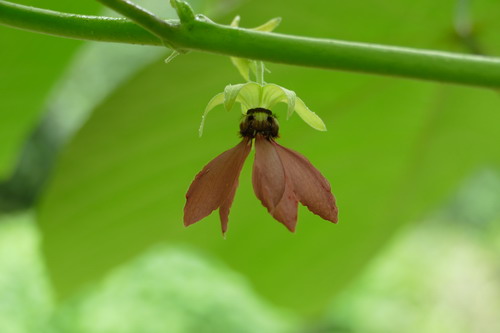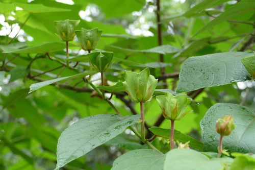 昂天莲是莲么?当然不是,它种在华南植物园生物园,跟朱槿、木槿、木芙蓉共居一室,当然就是锦葵科的货了。昂天莲(Ambroma augustum (L.) L.f.),锦葵科昂天莲属灌木,又名鬼棉花、仰天盅、水麻和假芙蓉。大家都知道,锦葵科的物种大部分开的花都是高昂着头的,这里的“昂天”说的是它的花么?偏不!这里说的是它的果实,昂天莲的蒴果膜质,具五条纵翅,成熟时,舒展开像一朵盛开傲立挺拔的莲花。从侧面看,这果实又像如同一个个杯子,又有人称之仰天盅。它非同寻常,它的拉丁名是Ambroma augusta,其中种加词augusta就是“庄严的,值得注目的”意思。
