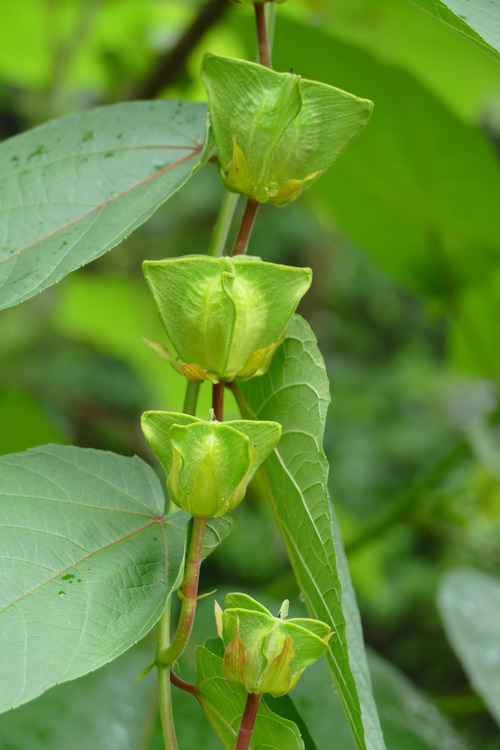 先看看它的叶子。其实花也好,果了罢,都在掩饰它的身份,唯有叶片说了实话,不经意它就暴露了它的锦葵科身份。你看它的叶片,是不是跟我们常见的木芙蓉呀,梧桐树呀叶片一样?其实在一种分类系统里,它是被划入梧桐科的。