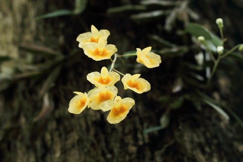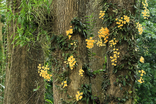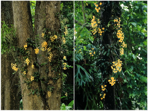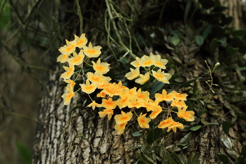开花时节的聚石斛是兰园最美的景致。兰园的聚石斛是附生在几棵大树上的,而且数量颇多,开起花来,黄花满树,远远望去宛若美人盛装,嫣然一笑间,点亮了整个园地景观。赏聚石斛最好当是在晴好的黄昏后,一弯新月挂上树梢头,月亮下一树黄花绽放,夜空中浮动着夏夜植物园特有的香气,此时若可约一两知心好友,在树下小石桌上沏一杯清茶,品茶赏花,真是良辰美景,赏心乐事了。