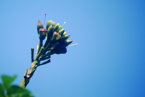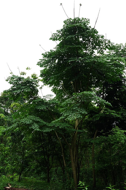 木蝴蝶(Oroxylum indicum)是紫葳科木蝴蝶属小乔木,树皮灰褐色,大型奇数羽状复叶,紫红色硕大的花朵,肉质厚实的花冠,檐部下唇3裂,上唇2裂,裂片微反折呈淡黄色。木蝴蝶三四层楼那么高的枝顶,骄傲地挺立着总状聚伞花序,远远就能望见,我曾无数次仰望树梢的风景,紫红色花苞聚在一起,像画笔一样把天空描摹成心中的模样,然而却难寻觅花的踪影,只有地上的落花默默的诉说着它的节律。