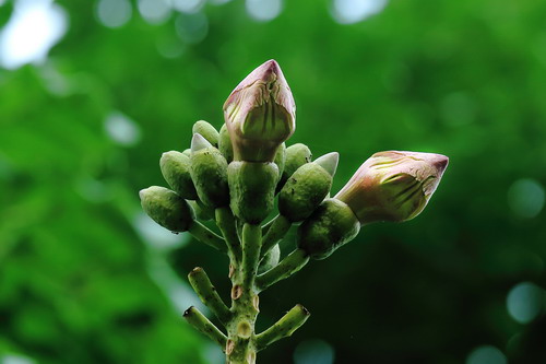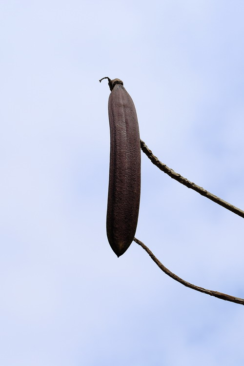 木蝴蝶的果实宿存时间长,南药路的木蝴蝶今年又在开花了,中心大草坪园林树木区的木蝴蝶还悬垂着去年粗大的果实。