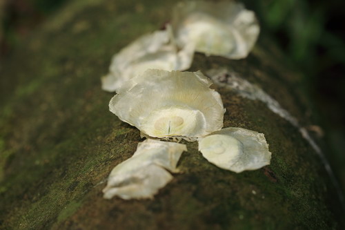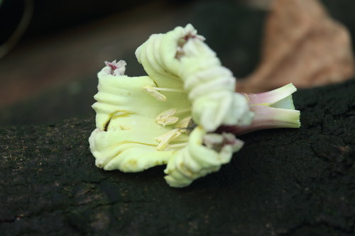 木蝴蝶的花在夏秋之际的夜晚开放。夕阳余晖之际,还是含苞待放的花苞,鼓鼓囊囊,翌日清晨只剩下紫色钟状的花萼和长长的花柱。木蝴蝶黑夜里开花,逐渐浓烈,然后凋零,单朵花的花期短短的一个夜晚。拾起草丛里的落花,沉甸甸的一大朵,雄蕊插生于花冠筒中部,花丝基部很特别,像棉花糖一样的白色棉毛。至于花的气味,《中国植物志》上说“有恶臭气味”,个人感觉略有差异,我也无法准确描述,反正大量的落花凑在一起有种闷闷的感觉。人嫌弃木蝴蝶花气味不愉快,拟阿勇蛞蝓等杂食性的小东西倒是欢喜,守在树下,哧溜的爬进落花里大快朵颐。
