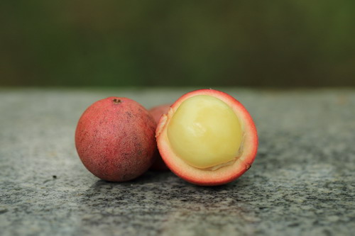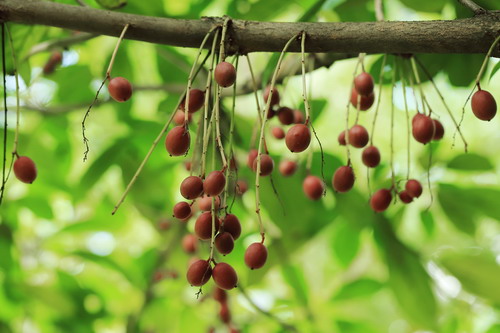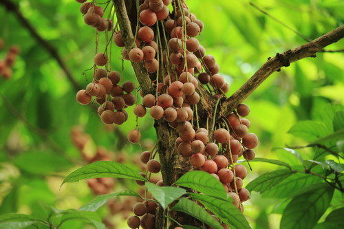每年六、七月间,一串串指头般大小的扁圆形果实就挂满了大树,从树干基部连到树顶,甚至坠弯枝条,由生至熟,或绿或黄或红;似绿玉雕成的小球、似乳黄的玛瑙珠子、或似鲜红的珊瑚念珠,煞是招人喜爱。其果肉多汁,酸甜可口,生津止渴,消暑解热。剥开果皮后,一口一个,味道相当好,就是酸酸甜甜野生无添加的味道。