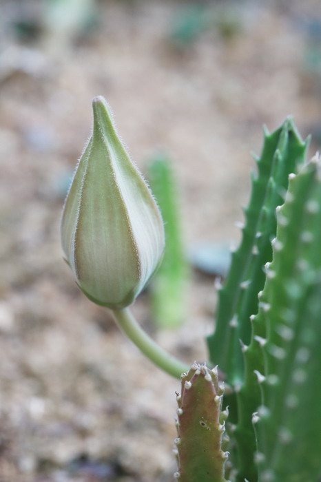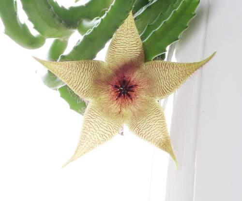 言归正传继续说花朵。花1-3朵从嫩茎的基部长出,花苞由小米粒大小慢慢长到有个小橘子那么大,开始花苞的棱边凸起来,颇有几分骨感,慢慢地不再长大只是越来越鼓,变成一个鼓鼓的小气球样,脾气也有点象气球,充气太满就要爆啦——花儿慢慢裂开盛放!盛开的时候花朵直径可达15-20厘米,花瓣5片,呈五角星形,外形象一只海星,所以也有叫海星花的。花瓣上有细腻的豹纹,密布细毛,毛茸茸的豹纹可爱极了。