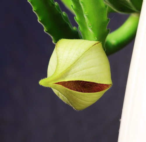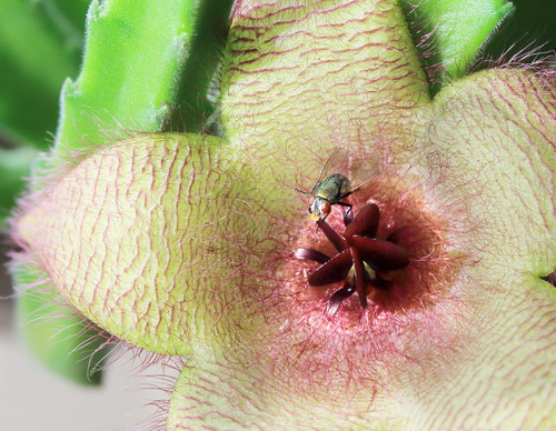 再来说说气味,花儿有特殊的腐肉臭味,所以也叫腐肉花。尤其是刚刚裂开一点小缝隙的时候,阴风徐徐怪味飘飘,这种特殊的气味有谁喜欢?自然是爱好腐肉的昆虫了,智慧的花朵依靠这特殊的气味吸引昆虫过来帮助传粉,看过好多小昆虫光顾,暂时未见结出果实,可能因为是外来植物,气候等等和原生长地有差异的缘故吧。