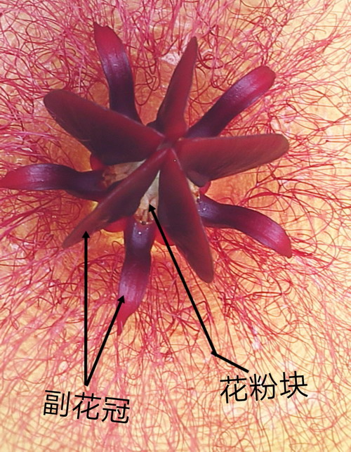 说是花,怎么没看到雌蕊雄蕊?原来它们的雄蕊和雌蕊粘合生成中心柱,称合蕊柱,花粉结合包在一层柔韧的薄膜内,成块状,称花粉块,花粉块和副花冠特征这是萝藦科植物的特征之一。