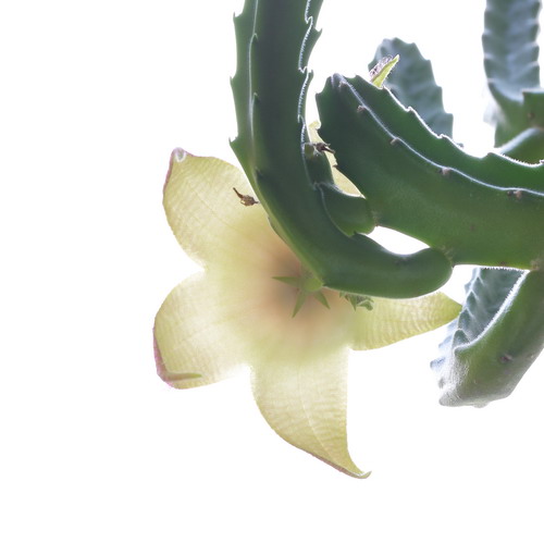 大花犀角(Stapelia grandiflora Masson),萝藦科豹皮花属植物。原产南非,多年生肉质植物,植株丛生,四棱柱状茎直立向上生长,高20-30厘米,粗3-4厘米。基部分枝,有齿状突起,老茎灰绿到褐色,新茎翡翠般的绿色,阳光下像绿宝石。也有说大花犀角的肉质茎形如犀牛角,估计植物名是据此而来吧。