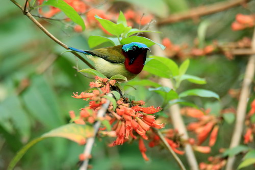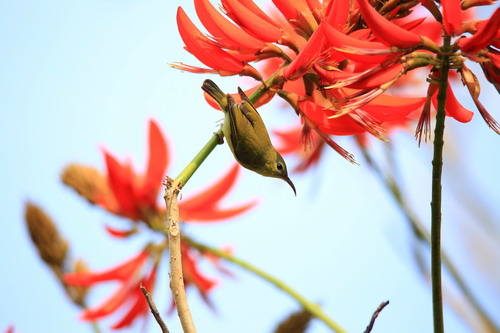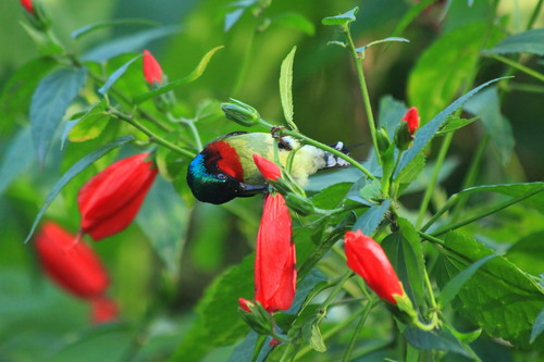 最近几年华南植物园内的叉尾太阳鸟明显增多,因为园内增加了蜜源植物的种植,尤其是叉尾太阳鸟喜欢的蜜源植物,有效地吸引了叉尾太阳鸟等野生鸟类和蝶类在园内繁衍生息,营造了花鸟昆虫等生物多样性的生态环境。