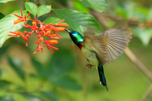 叉尾太阳鸟与它钟爱的花的魅力画面