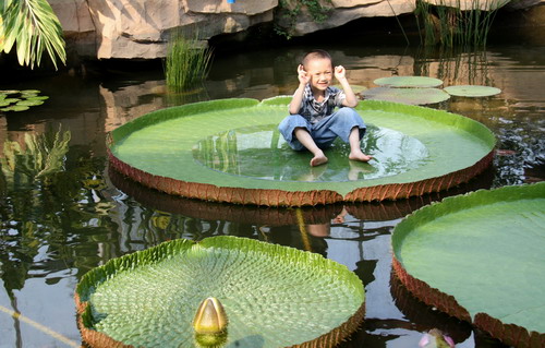 克鲁兹王莲巨大叶片能承重一个小孩(资料图,摄于热带雨林温室)