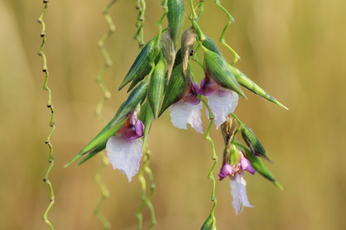 垂花再力花细丝状的花亭,一根根高高的挺出叶面,延伸出植株2倍高度。蝶状花朵倒挂在之字形的花梗下,在微风中轻轻晃荡,姿态飘逸,像身手不凡的杂技师在做高空舞蹈。与再力花相比,垂花再力花植株更为高大,花序下垂、耐寒性较差。