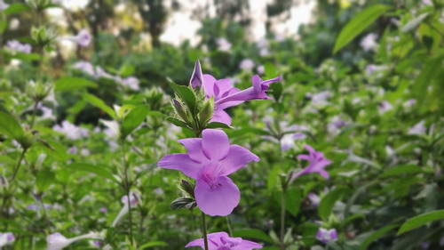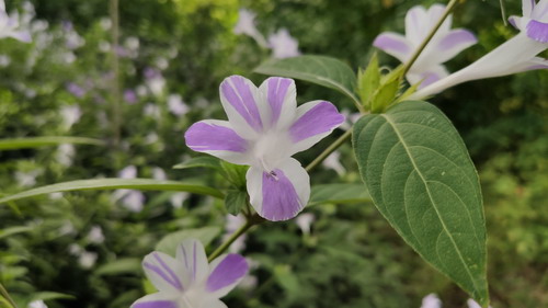 双色假杜鹃(Barleria cristata ‘Lavender Lace’),又名条纹假杜鹃,为爵床科假杜鹃属假杜鹃(Barleria cristata L.)的栽培品种,这种常绿小灌木高约1米;茎圆柱形,被柔毛;叶对生,叶片长椭圆形至狭卵状披针形;聚伞花序顶生或近顶端腋生,苞片、小苞片边缘刺齿状,花冠管筒状,花瓣紫白相间,花形奇特,开花时宛如一个个欢歌的小喇叭,美丽动人。