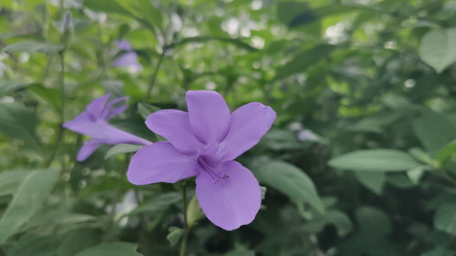 在盛开的双色假杜鹃中偶尔夹杂着一些蓝紫色的花朵,花瓣上并无条纹,而是那种纯净的蓝紫色,它们就是假杜鹃了,看起来有点儿孤单,却又那么和谐,毕竟它们具有一定的“亲缘关系”,但又能让你一眼就区分它们的不同。
