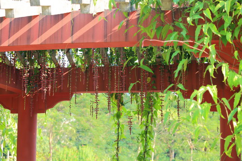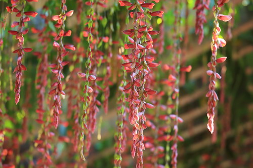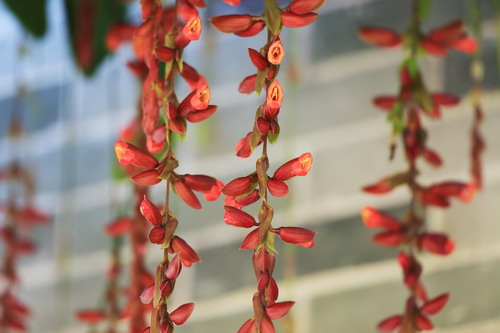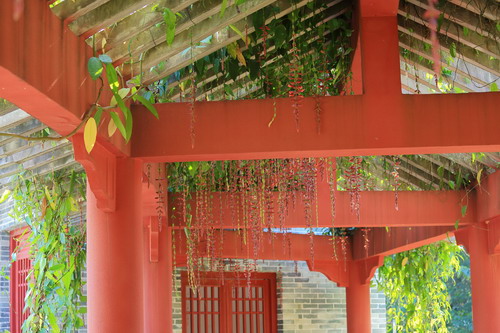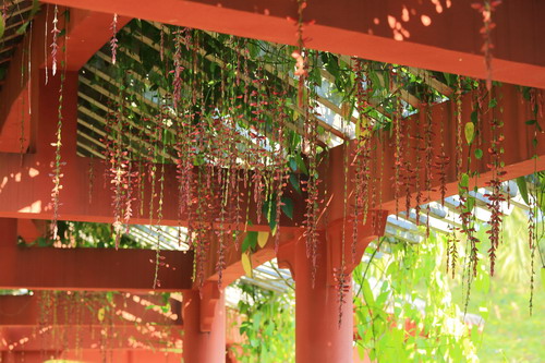 红花山牵牛是攀援藤本,顺着廊架攀援而上,垂挂下来一串串长长的花序。花还没开时,一个个红色的花蕾挂在藤蔓中,就像一个个小辣椒。花开时,鲜红耀眼,就像一挂天然的红鞭炮,格外夺目。漫步廊架,举目间见一朵朵红花疏落有致、排列整齐,有的含苞待放,有的灿然开放,随着微风舞动,好不动人。