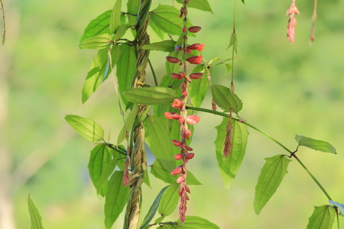 红花山牵牛Thunbergia coccinea,爵床科山牵牛属藤本。它与我们耳熟的旋花科的牵牛花很容易搞混。从植物学上来说,两者之间没啥关系,但既然叫它“山牵牛”,大概是因为它与牵牛花都是攀缘性藤本,同样具有顽强的生命力,又常生于山野林中吧。