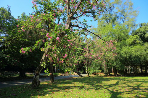 红花羊蹄甲观赏地:景观园路(此处为嫁接)、园林树木区、凤梨园旁草坪路边、西门围墙边、望瀑桥